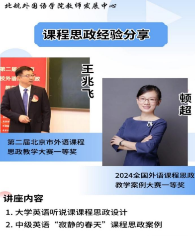 顿超老师是翻译系教师,北航优秀主讲教师。她分享的是为翻译专业二年级员工开设的《中级英语》课程,该课也是北航校级一流本科课程。她分享的内容是课文“Silent Spring”的教学设计。顿老师从学情分析、教学目的、教学方法和教学流程四个方面阐述了自己的设计理念,采用“产出导向法”为员工提供了语言和内容上的促成,引导员工深入探讨“人与自然的关系”这一思政主题。