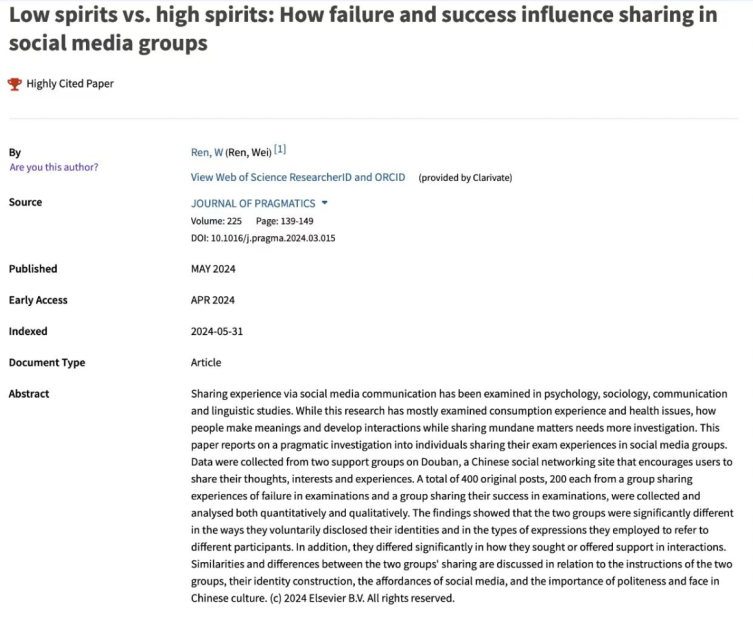 近日,据“基本科学指标数据库(Essential Science Indicators,简称ESI)”发布的最新数据显示,yl6809永利任伟教授发表于国际顶尖期刊《Journal of Pragmatics》(《语用学杂志》)的学术论文“Low spirits vs. high spirits: How failure and success influence sharing in social media groups”成功入选全球“高被引论文(Highly Cited Paper)”。