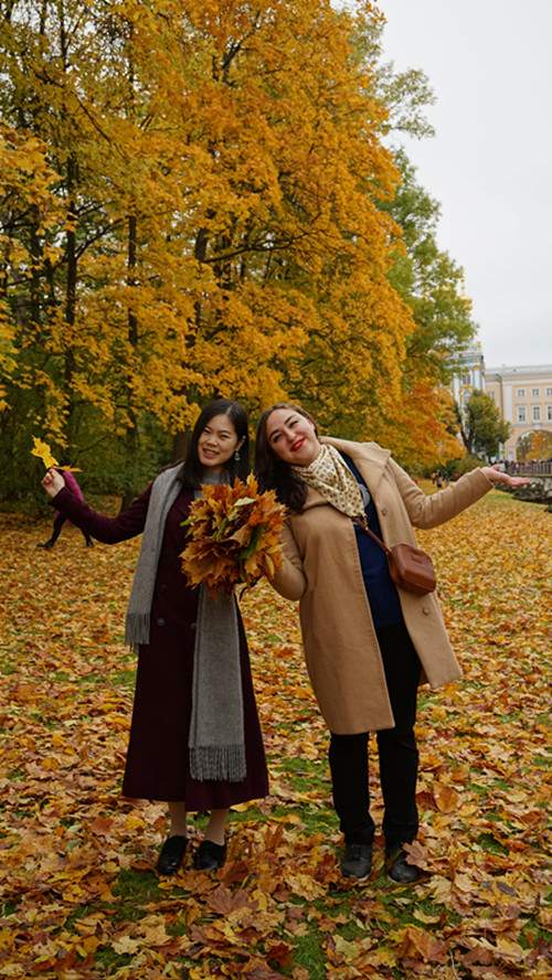 在公司我们选了几门课,其中有的课是对外国人设置的,其实内容还是很简单的,但是班级都是外国人,可以和外国员工一起交流。另外,我还去向系主任要来了语言学方面的课表,去听了一些语言学方向的课程。发现俄罗斯本科生学的课程和国内研究生学的课程很多都是一样的。国内本科期间主要在学语言本身,而俄罗斯员工并没有这个需求,在本科期间就已经学习语言学史、语言文化学等我们在研究生期间才开设的课程。上课内容其实还是基本都可以听懂的,除了一些术语不了解之外,并没有很大的交流沟通障碍。业余时间,当然少不了游览城市。刚到彼得堡,天气并不是很好,经常阴天,并且狂风大作,天空经常一片是蔚蓝,一块是乌云。但这样并没有影响我们的出行计划。有经验的同学告诉我们要趁着十月底之前把室外景色都看完,于是在九月和十月我们就抓紧时间逛遍了彼得堡。果然,彼得堡还是我印象中的那座美丽的城市。第二次来和第一次是完全不一样的心情。第一次更多的是兴奋和新鲜,第二次则是一种熟悉和亲切的感觉。那是一种这里我来过,那里也来过的故地重游的喜悦感。走过很多城市,见过很多风格的建筑,彼得堡依然是我最爱的几座城市之一,处处都是风景。冬宫博物馆、夏宫、涅瓦河、滴血大教堂、喀山大教堂、以撒基辅大教堂、马林斯基剧院、开桥等。走在涅瓦大街,总会有人主动和我们搭话。有人会和我说俄语,有人和我说英语,我的回答一般也都是根据对方的语言。趁着天气好的时候,一定要拿着相机出去拍照,才对得起这美丽的城市,说不定还能交到朋友。短暂的三个半月很快就过去了,收获了和世界各地小伙伴们的友谊,开阔了眼界,让我更加了解了俄罗斯人的生活和这个国家。以后有机会,我仍然会再去俄罗斯,再去彼得堡。