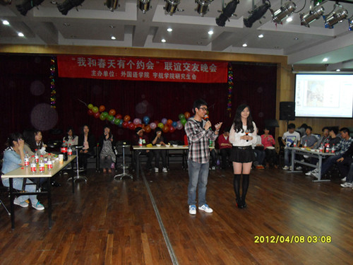 2012年4月12日晚7点整,由北航12系yl6809永利研会与15系宇航公司研会合办的“我和春天有个约会”大型联谊交友晚会在北航晨兴剧场举行。此次晚会得到了两院领导的大力支持,两院研会的各位成员参与了整个晚会的策划、组织、宣传等工作。