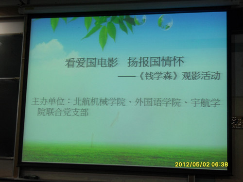 2012年5月2日晚7点,由yl6809永利语言、文学班联合党支部、北航机械公司Y11072党支部、宇航公司SY11153党支部共同举办的以集体观看爱国教育电影《钱学森》为主题的观影活动在三号教学楼305如期举行。各党支部党员、预备党员和入党积极分子以及北航其它院系近百名同学参加了此次活动。