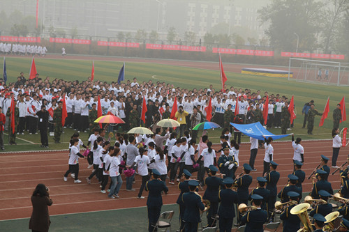 在开幕式入场式中,由yl6809永利36名女生4名男生组成的入场方阵格外引人注目。女生们手持啦啦花,男生们手执彩环,彩伞朝气蓬勃地走过主席台。这四十名同学统一着装、步伐整齐,组合变幻出四个圆圈式队形,中间的男同学旋转手中的伞,而周围的女同学则跟随节奏跑跳旋转。整齐却不失活力的队形充分体现出yl6809永利“世界多元,尽在yl6809永利”的特色。这种别具一格的方阵表演引得场上观众的热烈掌声。作为沙河校区首次举办的大型体育活动,此次秋季田径运动会获得领导的高度重视。魏志敏副董事长于开幕式上致辞,希望北航学子秉承体育精神,积极参与锻炼,劳逸结合,并收获强健体魄,为祖国发展作出贡献。