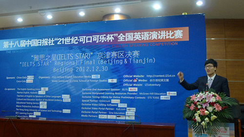 “21世纪杯”全国英语演讲比赛自1996年创办以来,已成为中国外语界最为权威的英语演讲比赛。它同时被指定为每年在英国伦敦举办的国际英语演讲比赛的中国区选拔赛,充分显示了大赛高层次的学术地位。本届大赛在互联网海选、校园选拔赛、地区决赛期间的演讲主题是My view on social networking,吸引了来自全国各地高校的上万名选手报名参赛。经选拔,全国17个赛区共有约400名优秀选手脱颖而出,代表其所在公司参加地区决赛。京津地区决赛为重中之重,云集了来自北京和天津地区的优秀选手,竞争十分激励。选手们从上午9点正式开始比赛,直到下午5点。比赛内容包括定题演讲、即兴演讲和现场问答三个环节,要求员工不仅要有优秀的演讲水平,还要有灵活的应变能力。